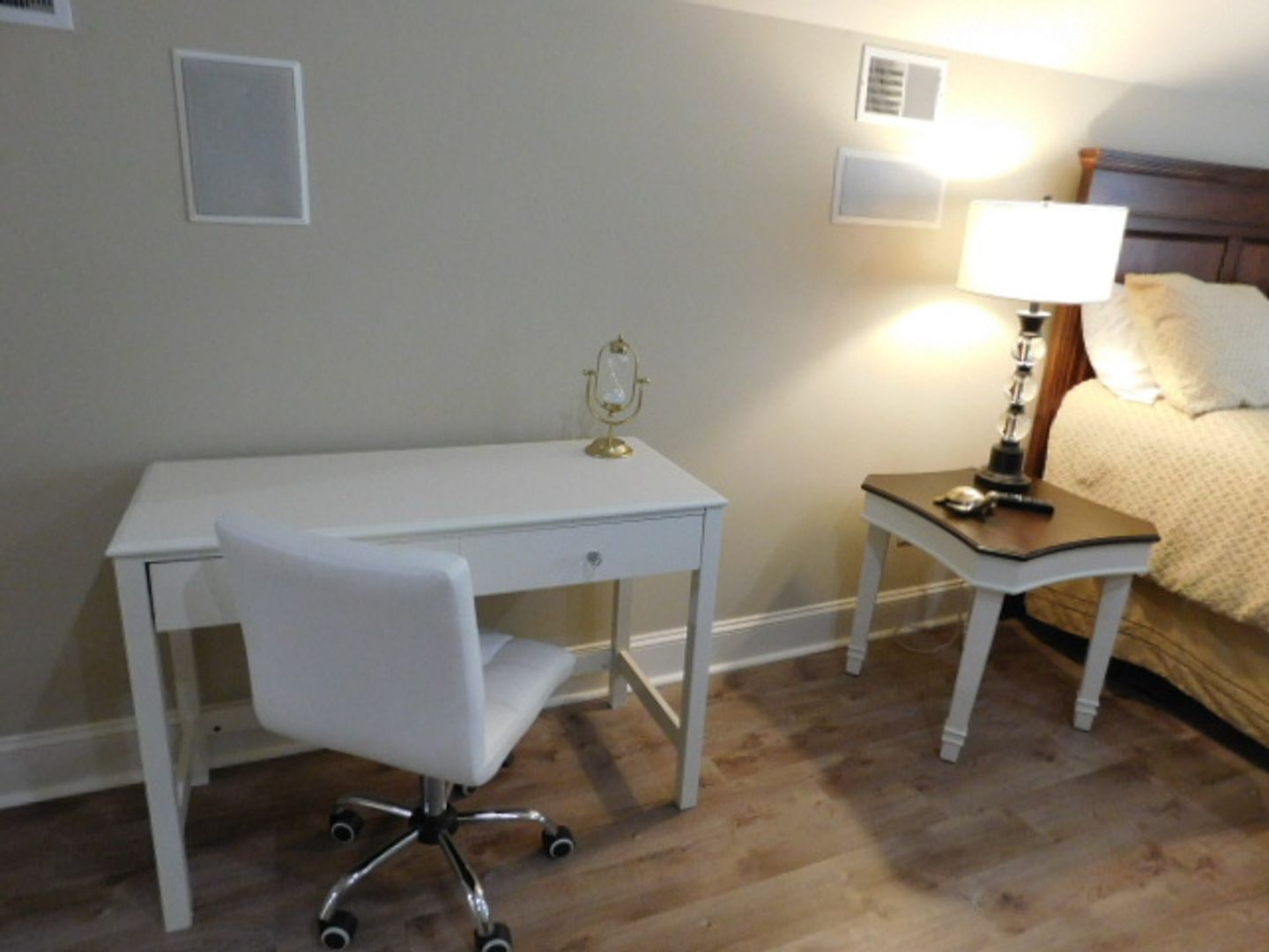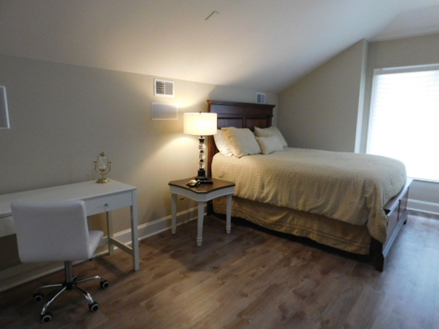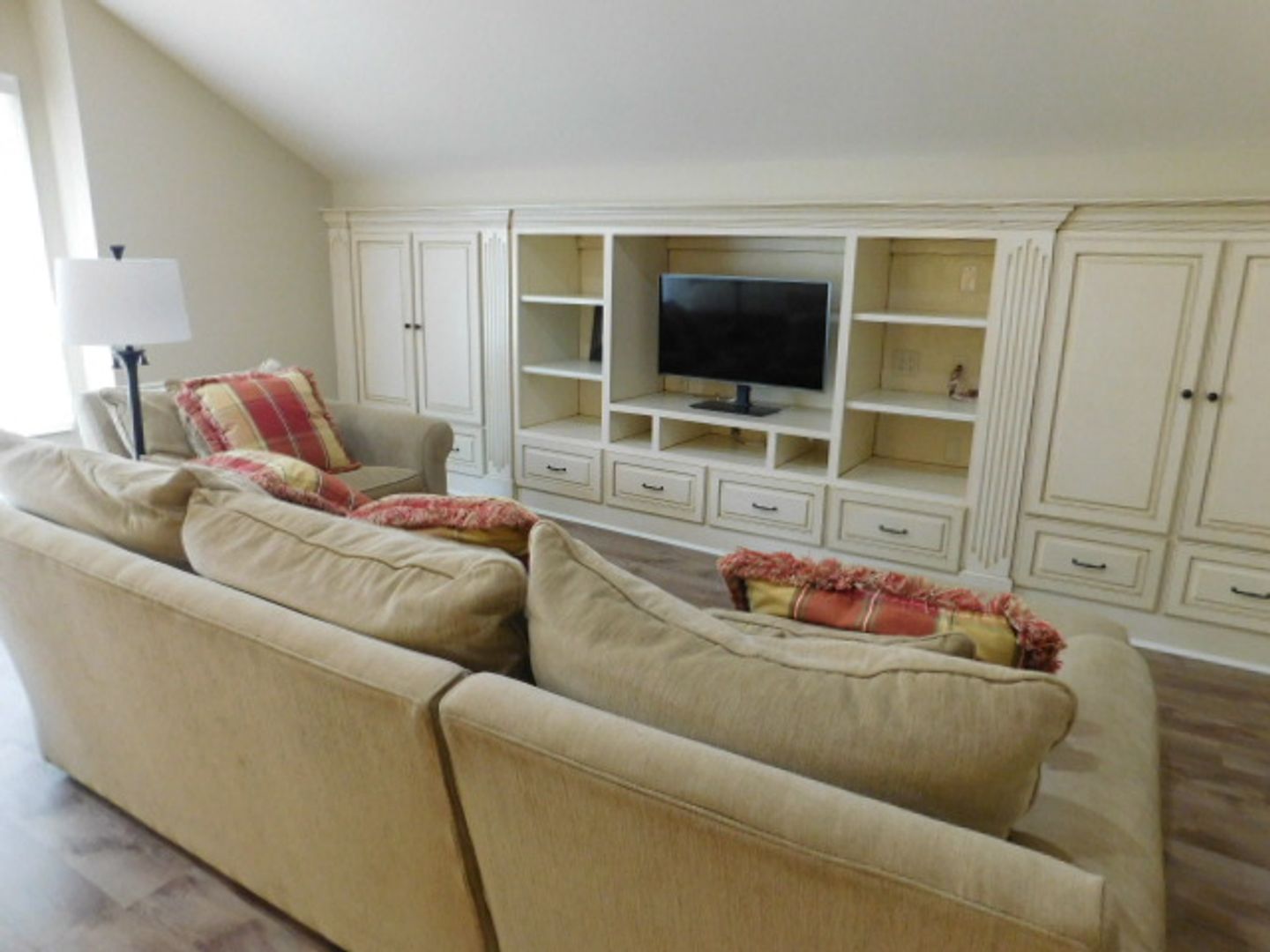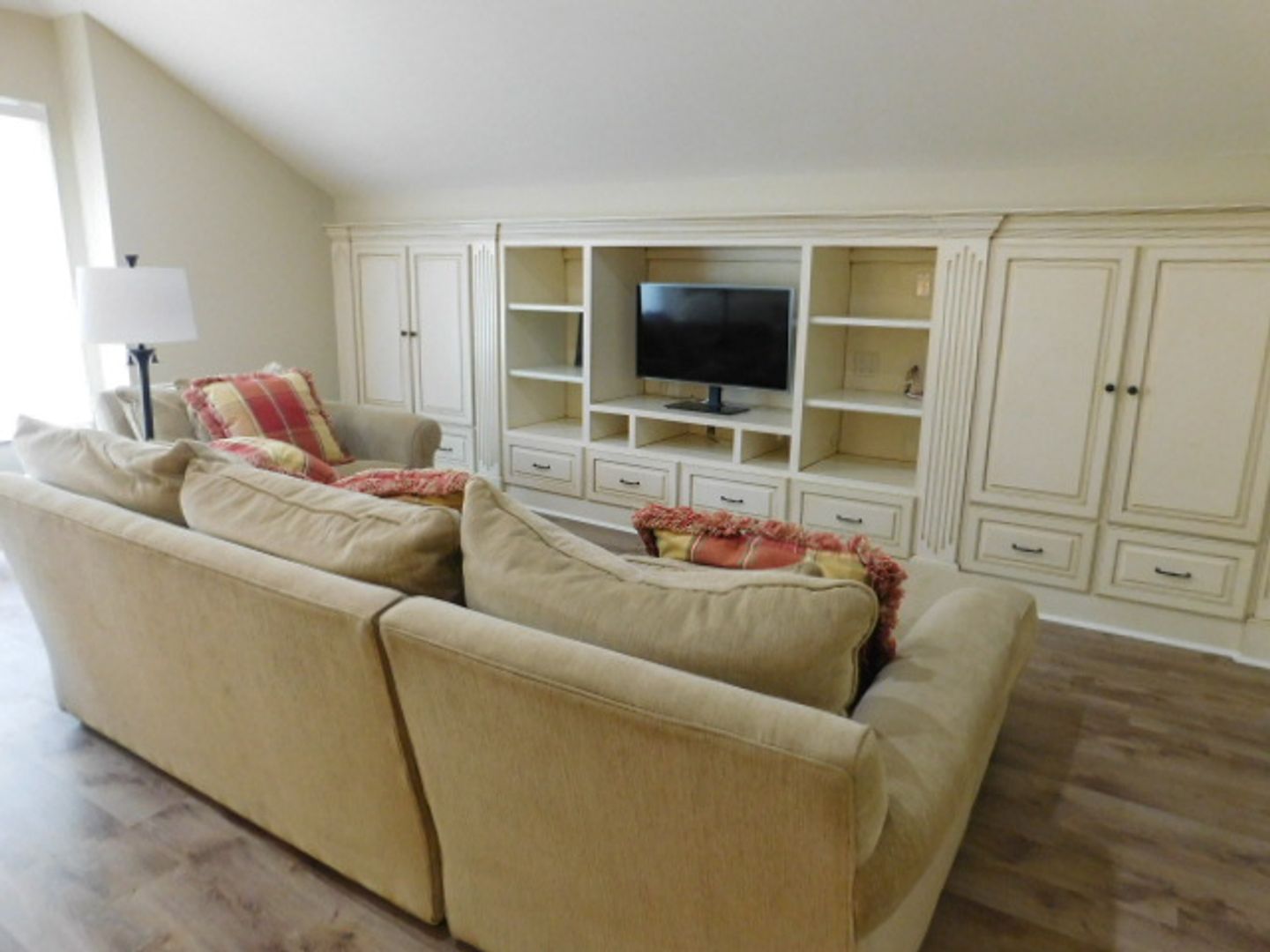 The home has travertine floors and LVP flooring throughout. The welcome area has a beamed coffered ceiling where you can sit, enjoy your coffee or cocktail. The spacious kitchen has granite countertops, filtered water fountain, GE Café wall oven with a built in microwave oven, and is fully equipped with nice cookware and everyday dinner ware. The living room area has a 75" television screen, built in cabinetry and surround sound speakers. The dining room area has a table that seats 6-8 people and wall windows. The primary bedroom has a 65" TV, large walk-in closet, soaking tub, easy walk-in shower with two heads and jets. The two bedrooms have their own hallway and are spacious with closets and large windows. All the bedrooms have ceiling fans and soft shades. A lovely wrought iron stairwell takes you up to Bedroom Suite #4 that feels like your own villa. It has an office with built-in cabinetry a beverage center, bedroom with Queen bed , large sectional sofa with TV, and a full bath, with tub & shower. The 2-car garage connects to the laundry room that features a large front loader washer & dryer, and built-ins with an area for folding. Lots of storage, closets, and rooms for your extra items. Central Vacuum throughout the home. Small, private back patio for entertaining. Pets considered. Landscaping, pest control and HVAC services included. No smoking. $5500.00 per month!